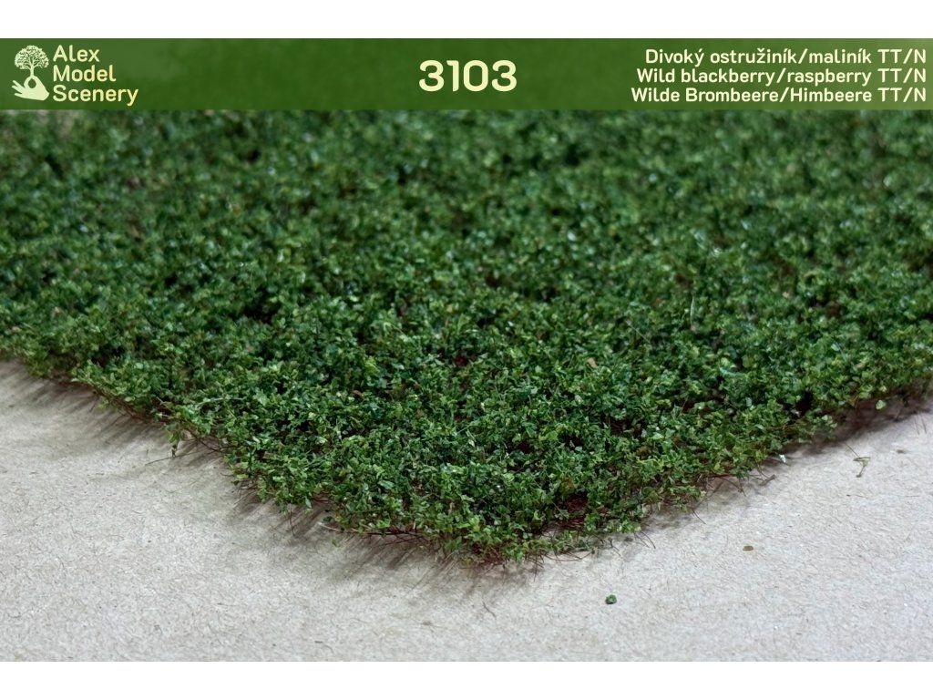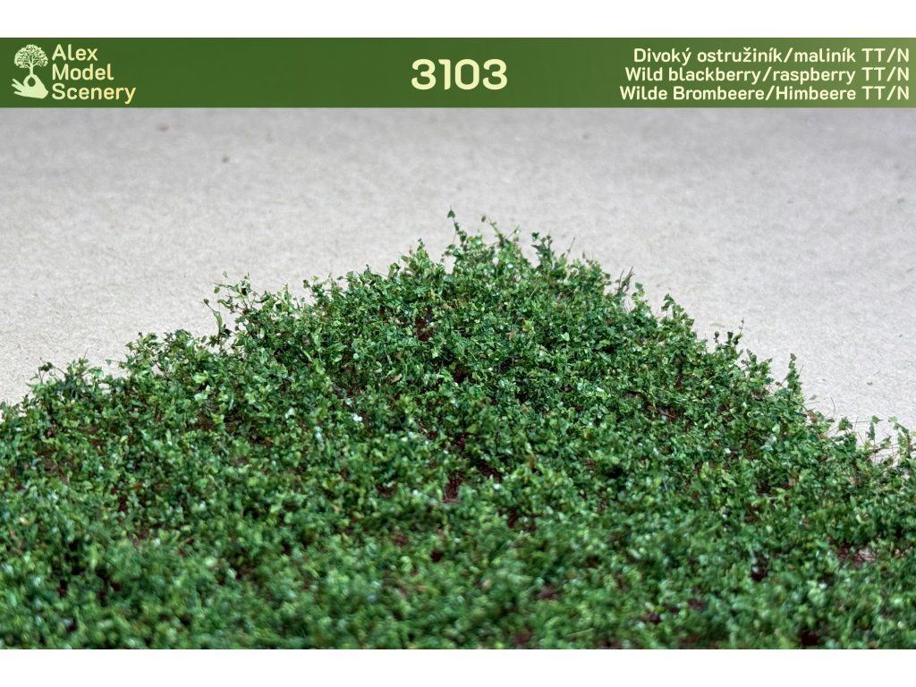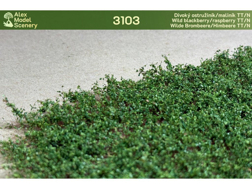 Náš starý, známý a trnitý, který se vyskytuje na každém náspu nebo podél cest. Realisticky imituje jak barvou, tak tvarem prorůstající šlahouny ostružiníku/maliníku, proto i po natrhání působí věrně. Varianta s jemnějšími listy a nižší výškou pro měřítko TT/N.