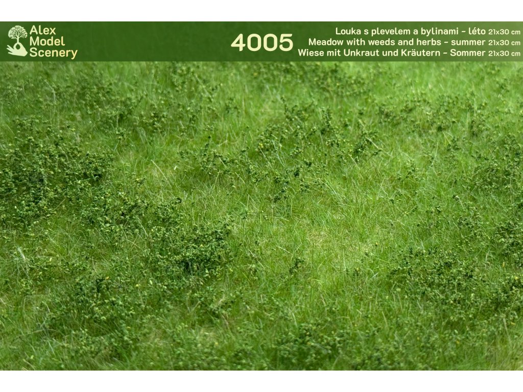 Realisticky ztvárněná zcela univerzální louka/násep posetá nízkými plevely a bylinami 21x30 cm